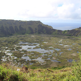 Onze wandeling start vanaf het hostel helemaal tot aan de top van de dode vulkaan Rano Kau, 324m boven zeeniveau. Het is een stevige, maar hele mooie klim omringd door bos tot boven. Je merkt goed dat we in een subtropisch klimaat zitten, want na een paar honderd meter zweten we ons al te pletter. Aan de borden onderweg te zien, wordt deze route wel niet veel meer gebruikt. Boven aan de Rano Kau genieten we van een prachtig zicht over de krater en gigantische oceaan. We spotten enkele vogels, waaronder de roofvogel ‘Chimango’, die aan het jagen is. De krater is 200m diep en heeft een diameter van 1.6km, waardoor ze de grootste krater van het eiland is. Bovendien is het gevuld met zoetwater waar kleine organismen (microfauna) in leven.