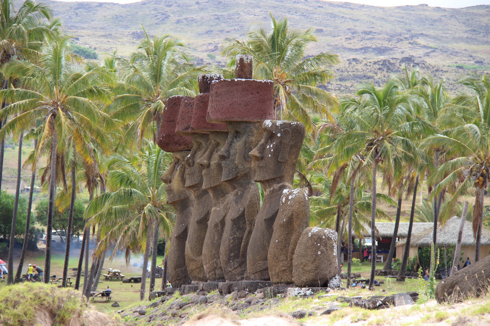 Tijd om door te rijden naar Anakena Beach en een verfrissende duik in de Grote Oceaan te nemen. Het is tevens ook de plaats waar Hotu Matu’a aan land is gekomen en zich gesetteld heeft. De Moai beelden die je hier ziet, Ahu Nau Nau, waren ooit bijna helemaal bedolven onder het zand. In 1978 werden ze uiteindelijk gerestaureerd en beschermt van het ophemelende zand. Het biedt je weer een heel ander zicht door de vele palmbomen op de achtergrond.